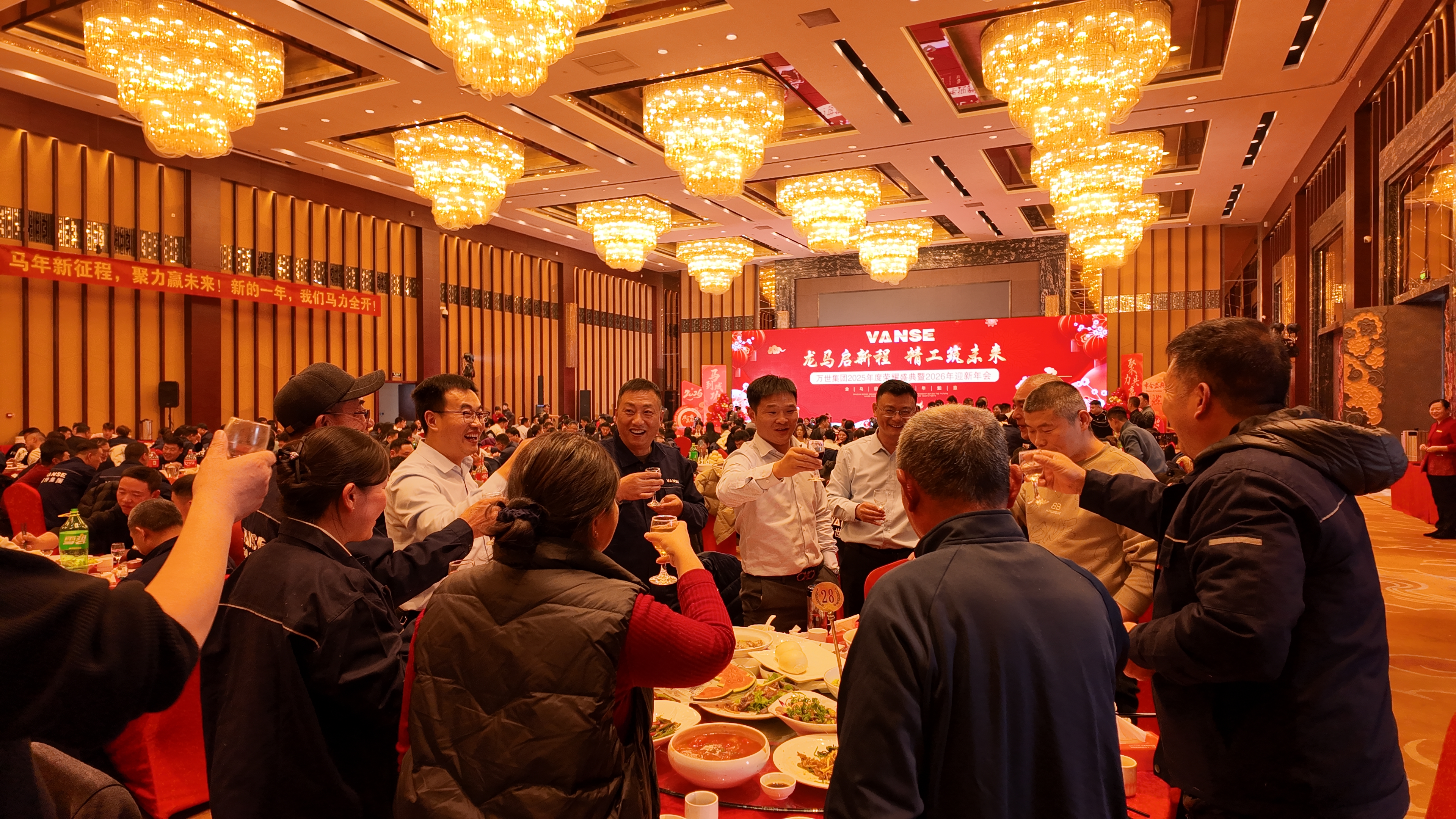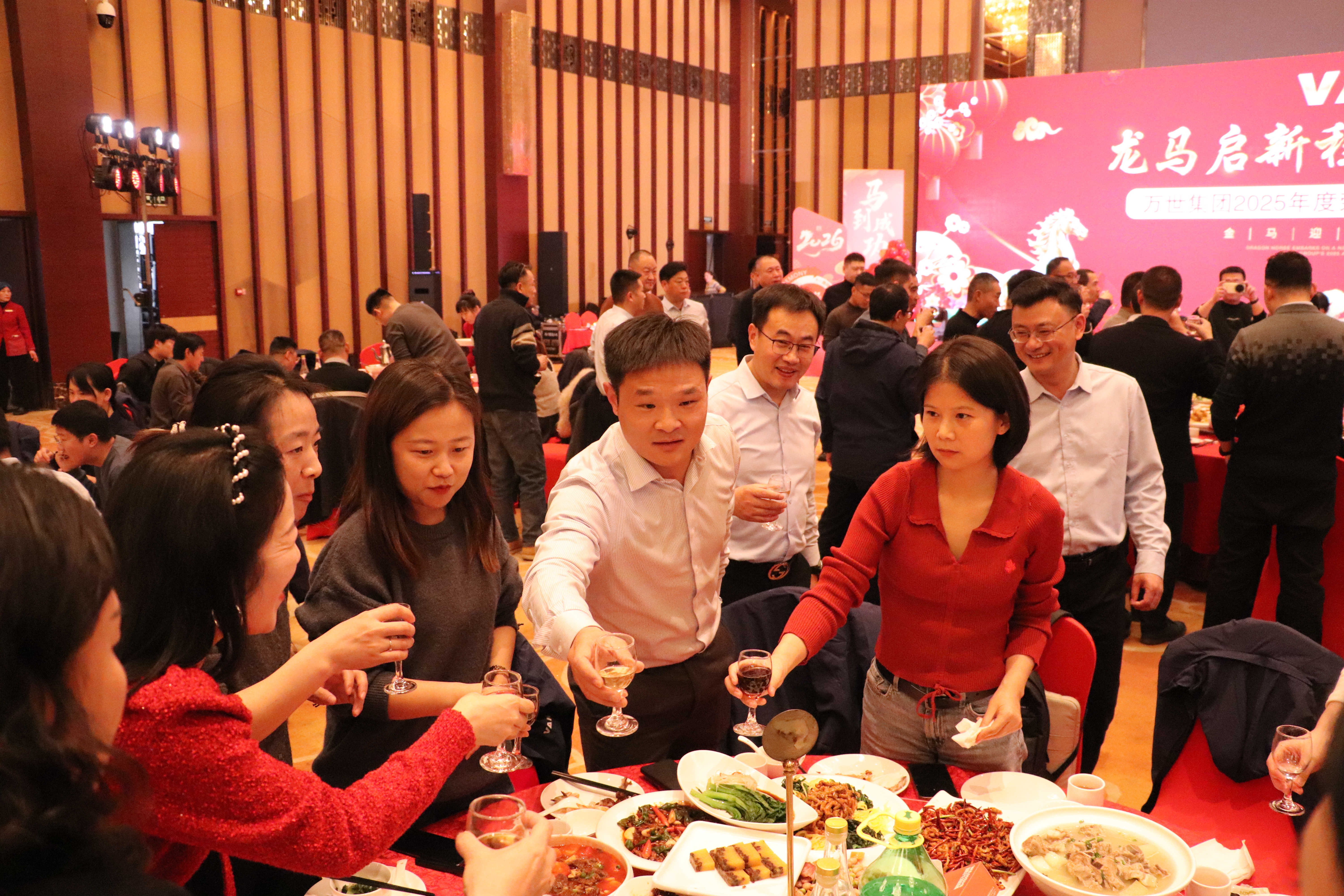 盛典尾声,董事长带领高层领导上台敬酒,向全体员工致以诚挚的感谢与新春的祝福。全体员工合影留念,定格下这一温馨难忘的时刻。随后,宴会正式开始,大家举杯同庆,在美食与音乐中畅谈过往、共话未来。